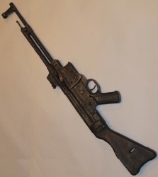 Wykonany ze stali, kolba drewniana, rękojeść z okładzinami z tworzywa sztucznego z wtórnie dodanymi paskami blachy. Karabin pozbawiony magazynka i osłony lufy. Mechanizmy niesprawne. |