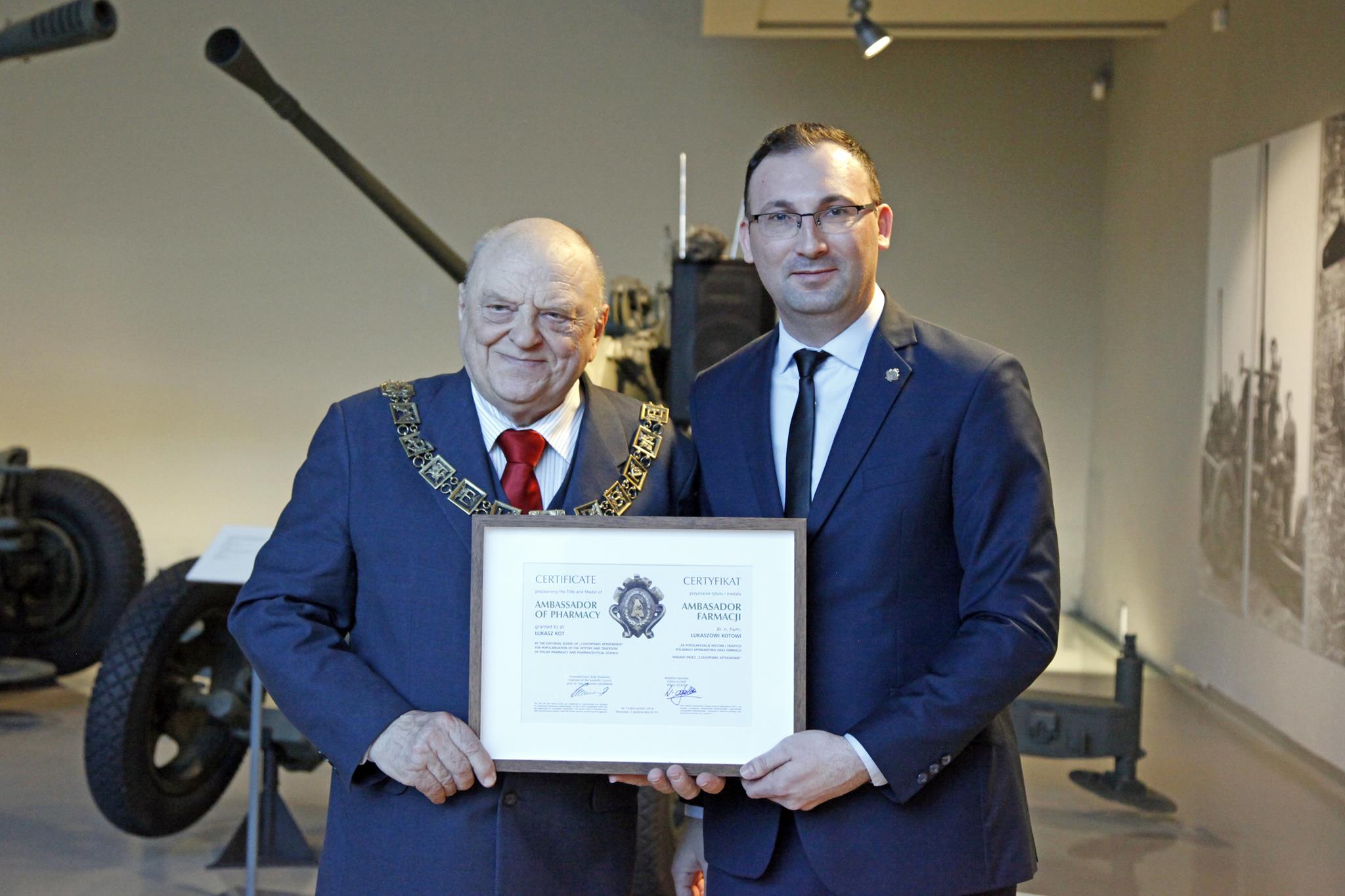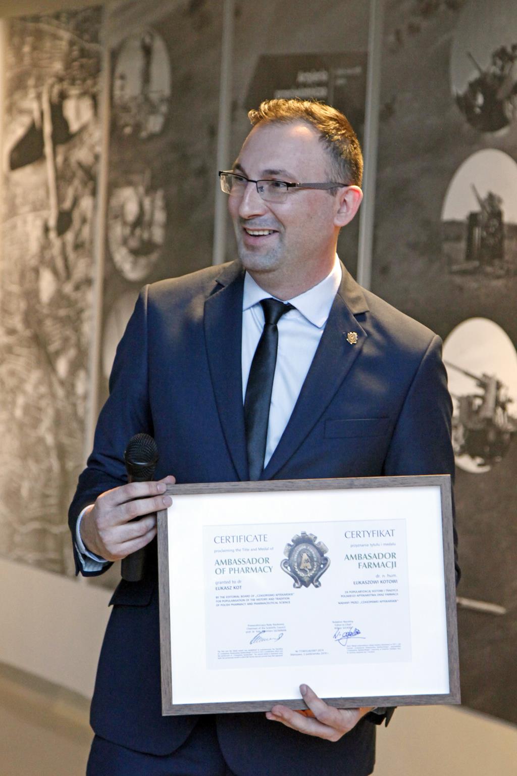 Podczas otwarcia wystawy dr Łukasz Kot otrzymał tytuł i medal Ambasadroa Farmacji za popularyzację historii i tradycji polskiego aptekarstwa oraz farmacji. Nagrodę wręczył redaktor naczelny "Czasopisma Aptekarskiego" Wiktor Szukiel.